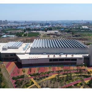體育館靈感來源于“礁石之方”,通過體塊的穿插組合,營造出海濱礁石的意象。館屋頂根據(jù)內(nèi)部空間使用,高低錯落,層次豐富。頂部天窗富有韻律動感呼應(yīng)內(nèi)部空間需求,有利于場館的自然采光。根據(jù)建筑的造型,屋蓋采用鋼桁架結(jié)構(gòu),鋼桁架的兩端支承在鋼筋混凝土柱上。其中鋼桁架一端為固定鉸支座,另一端為單向滑動支座。熱身館上方屋蓋鋼桁架的跨度為33.6m,桁架高度為2000mm,比賽館上方屋蓋鋼桁架的跨度為54m,桁架高度為2800mm。根據(jù)鋸齒型的建筑造型,在相鄰兩榀桁架的上弦和下弦之間采用H型鋼檁條聯(lián)系。鋼桁架的下弦通過系桿和交叉斜撐形成連續(xù)的整體。