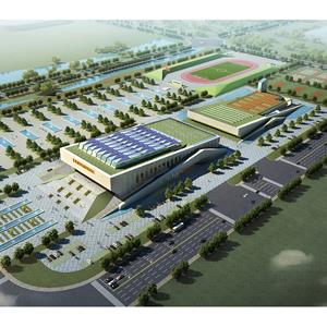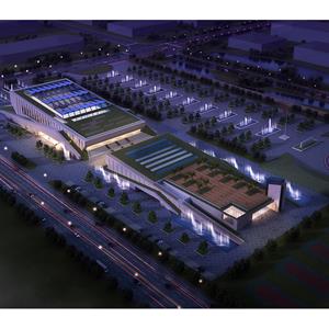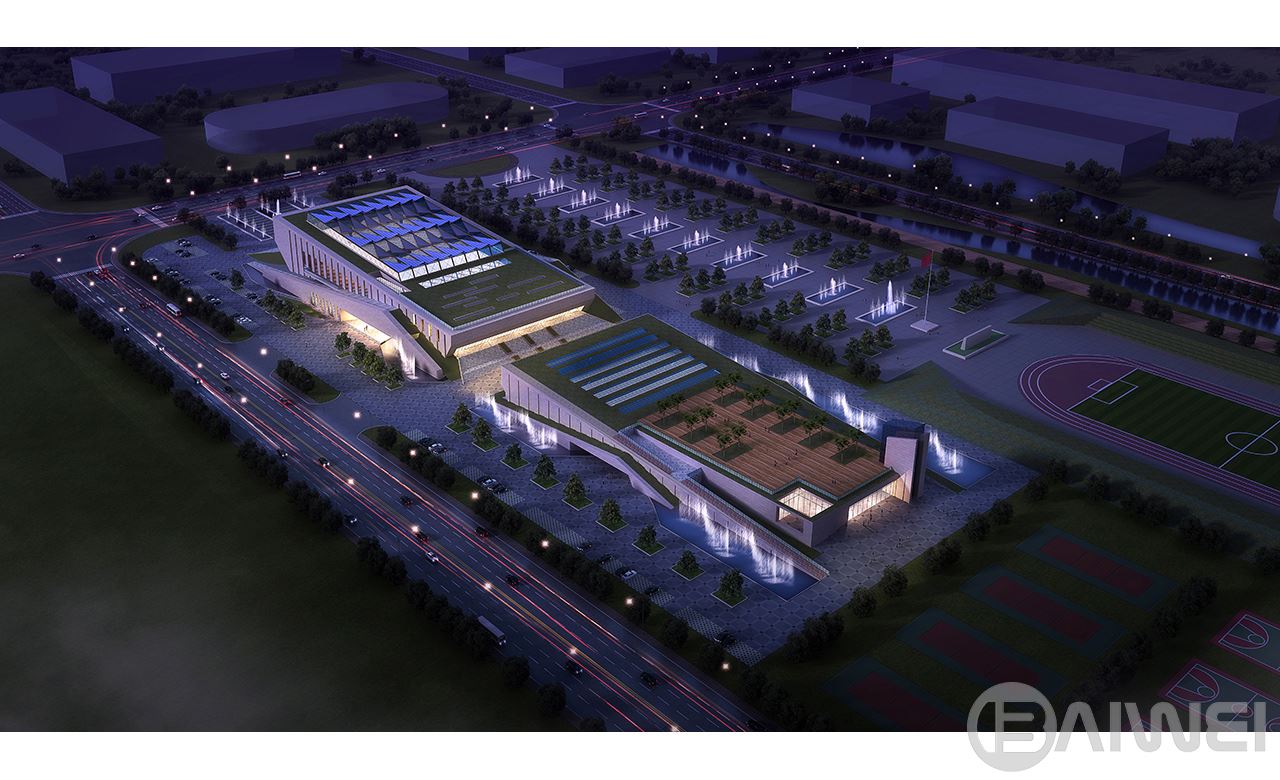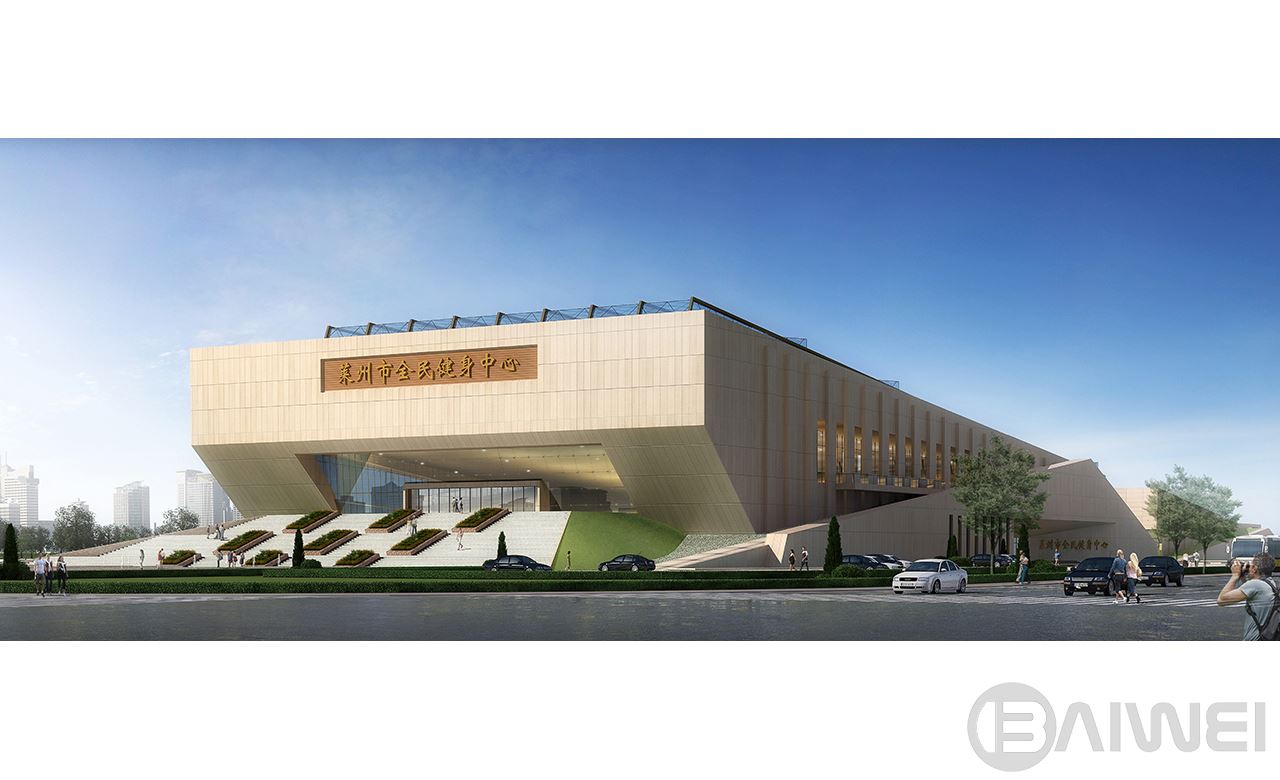 “靈石合出,福澤東萊”。本方案以:“靈石合出接祥瑞,全民健身福東萊”為設計主題,以彰顯萊州特色的山石文化。通過交匯而出的兩個石塊形成建筑基本體量,輔以流暢的線條和當地特產的石材,打造出渾然天成又極具萊州特色的全民健身場所。建筑順應地形,采用南北向矩形布局。同時根據用地周邊道路情況分別在場地南側的北苑路設置禮儀性人行主入口;東側的東嶺路設置機動車出入口 。考慮到體育場館使用上的特點,地面停車的方式更為方便,停車場沿場館周邊分散式布置。平面功能以主體育館為中心,周邊配以輔助空間,其中觀眾、賽事組織、運動員、貴賓、辦公人員等均有其單獨的入口,以達到分區(qū)明確,流線清晰,互補干擾的設計目的。同時訓練館與主體育館之間設置采光中庭,不但作為空間過度,豐富了內部空間同時還解決了大進深帶來的采光問題。