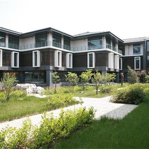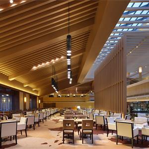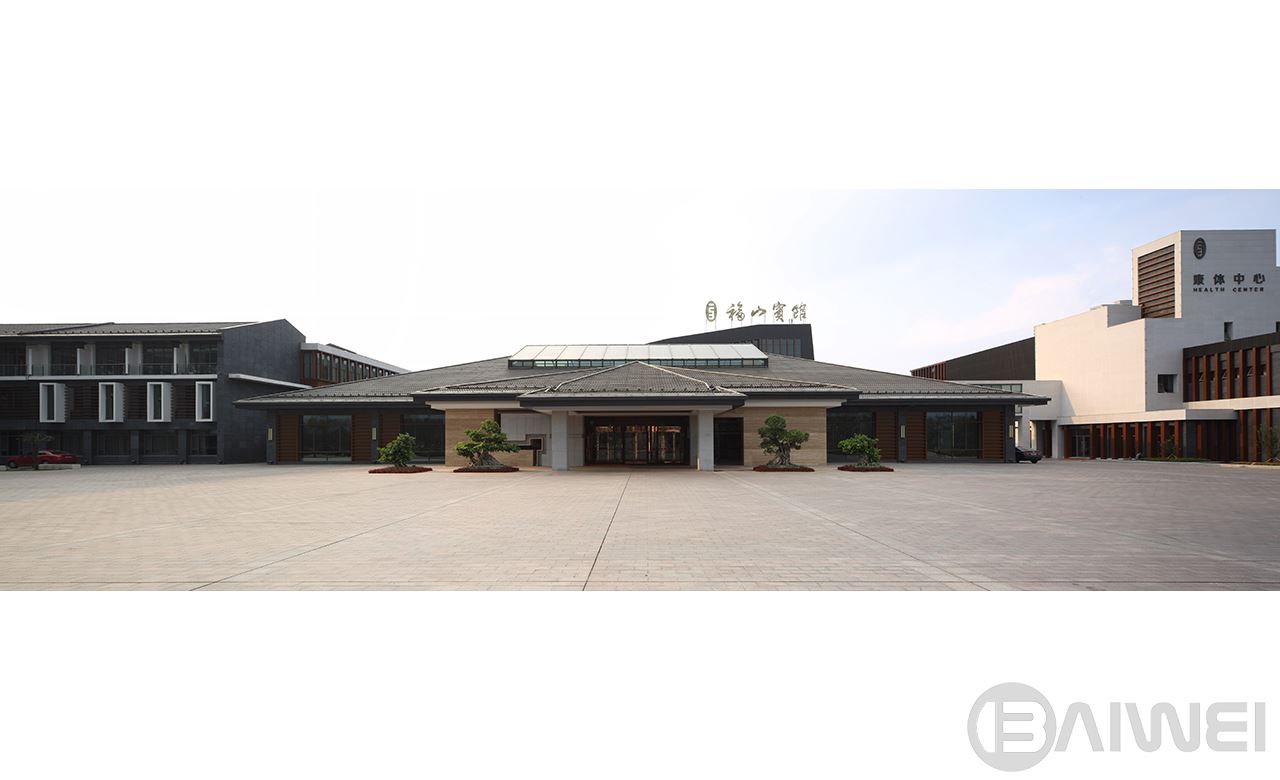 立面設(shè)計(jì)尊重地域建筑風(fēng)格特色,商務(wù)賓館采用深灰色瓦屋面,灰色石材墻面以及大玻璃窗相結(jié)合,整體建筑顯得高貴大方且穩(wěn)重典雅。整體立面強(qiáng)調(diào)比例劃分,特別在檐口和柱廊的細(xì)部處理方面,更具匠心??禈分行牟捎蒙罨疑饘偻鈮γ妗咨呐c玻璃幕墻,兩者建筑風(fēng)格協(xié)調(diào)統(tǒng)一,整個(gè)建筑群渾然一體。