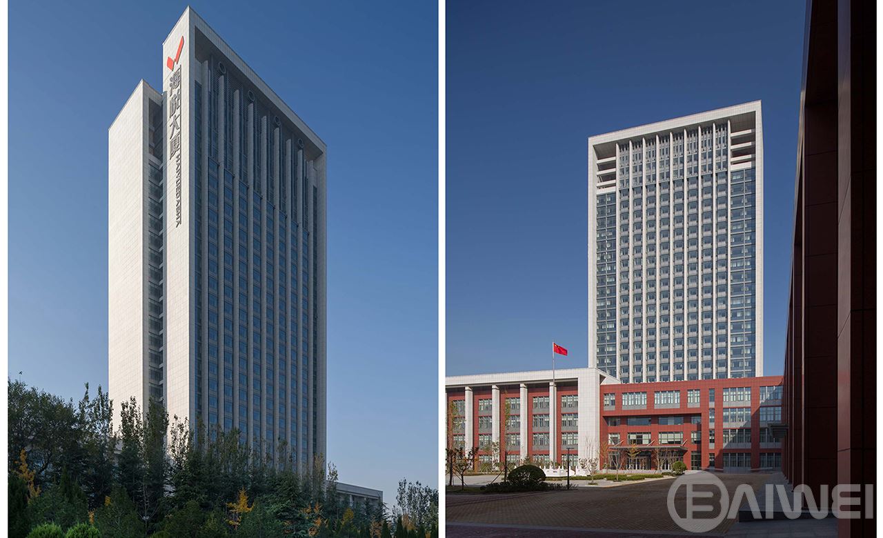 項(xiàng)目包括學(xué)院公寓、教學(xué)、圖書館以及信息中心、報告廳、辦公、后期與餐廳等功能部分。規(guī)劃在深入分析用地與周邊環(huán)境的特點(diǎn)基礎(chǔ)上,采用“兩軸一廣場”的規(guī)劃結(jié)構(gòu),將建筑與環(huán)境很好的結(jié)合起來,以入口廣場為中心進(jìn)行組織,綜合了辦公、后勤、餐飲與康樂部分的綜合體沿港城東大街布置,教學(xué)區(qū)則布置在用地南部,形成一個較為安靜的教學(xué)環(huán)境。兩者之間的聯(lián)系體是圖書館,三個部分圍合出一個面向西邊開闊的主入口。集中式綜合樓展現(xiàn)了現(xiàn)代建筑開放性及校園文化的多元性特點(diǎn),同時也符合煙臺地區(qū)的氣候特征。通過設(shè)計建筑間的灰空間與建筑中的共享空間,不僅豐富了室內(nèi)外空間層次,提供了人們交流欣賞大自然美景的視窗,而且通透、流動的空間感,也烘托出大方、莊重的黨校氛圍。