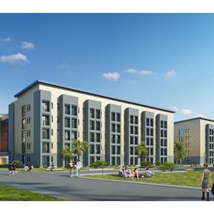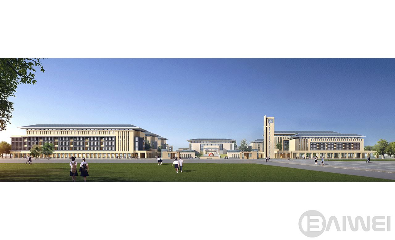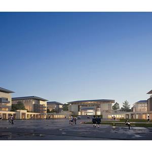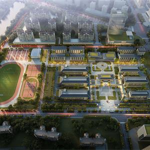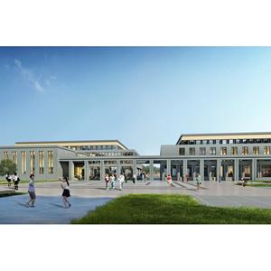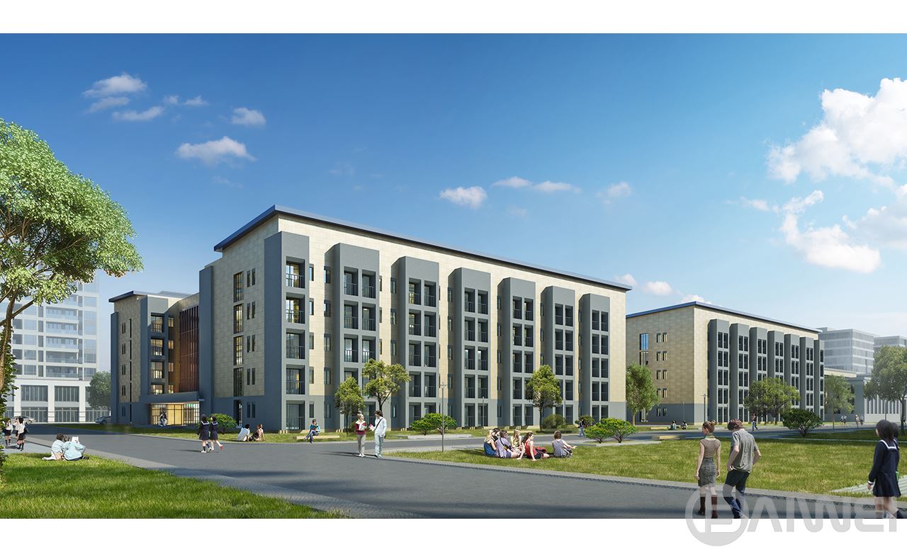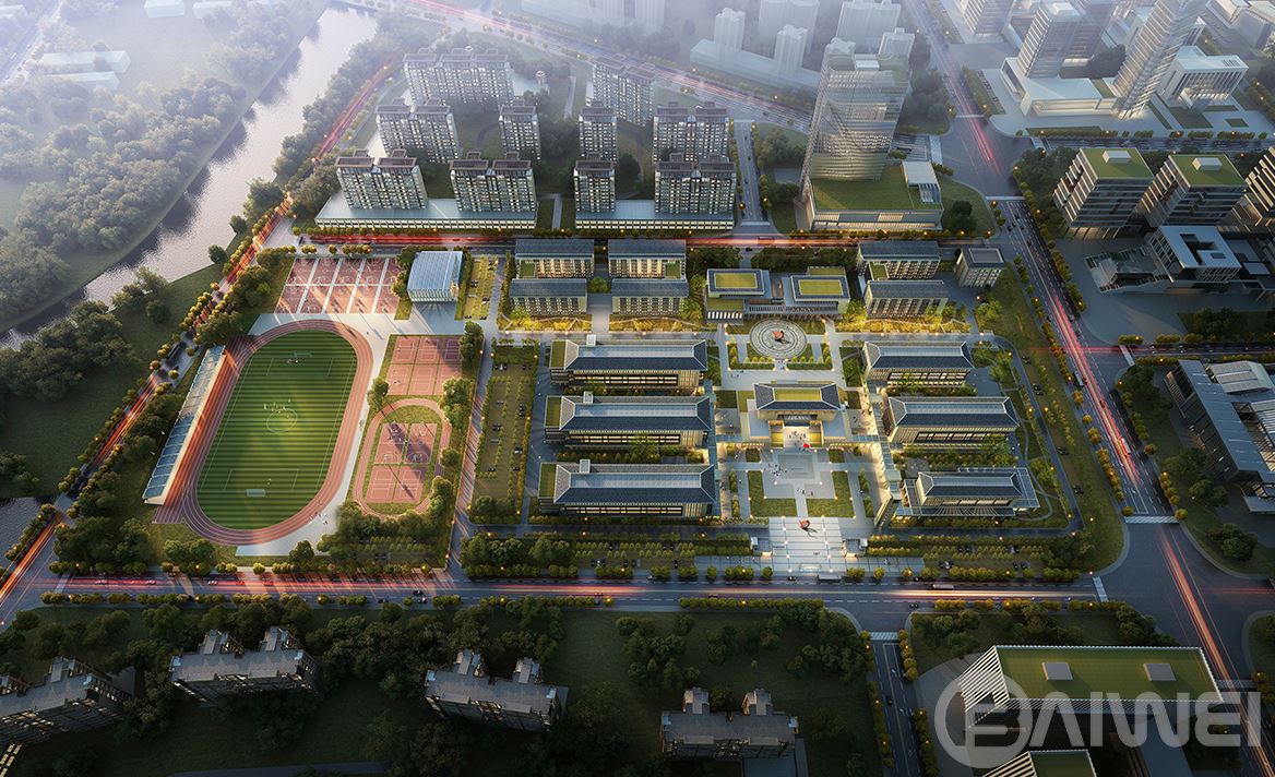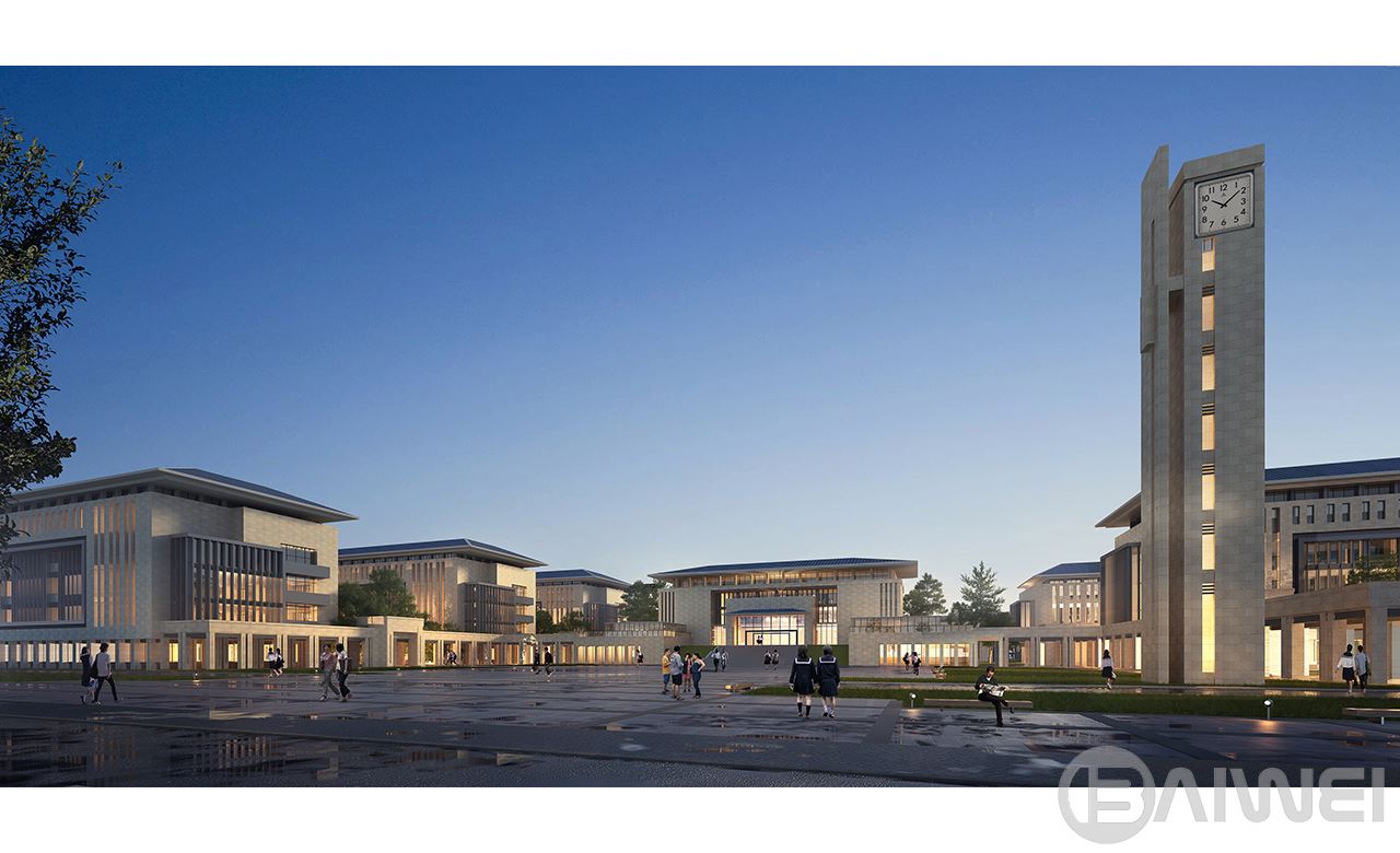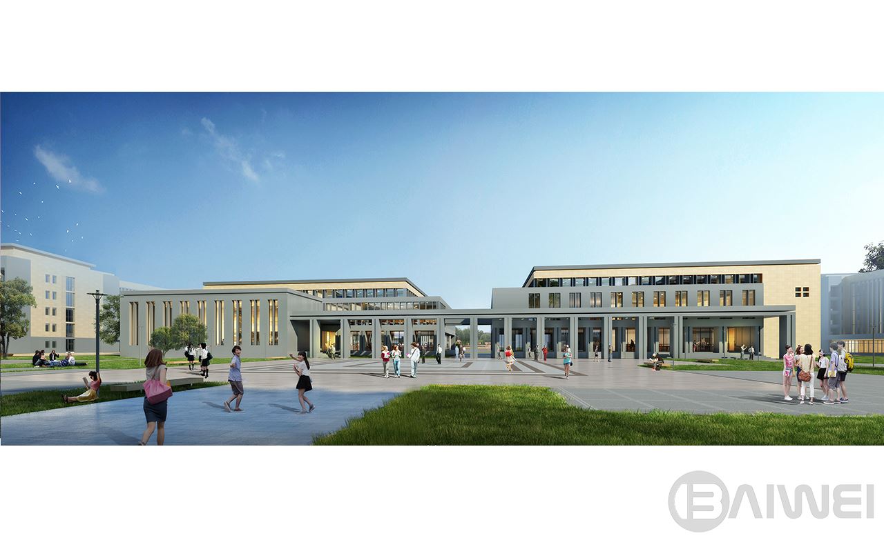 設(shè)計(jì)結(jié)合對外使用要求將藝術(shù)體育場館設(shè)置在校前區(qū)。教學(xué)區(qū)、運(yùn)動區(qū)和生活區(qū)則以品字形結(jié)構(gòu)布置,便于三種活動的聯(lián)系。核心教學(xué)區(qū)形成集約化教學(xué)空間,符合緊湊的用地情況,布局流暢,氣勢磅礴,長達(dá)數(shù)百米的教學(xué)樓連廊空間,具有強(qiáng)烈的空間序列感和導(dǎo)向性。圖書館位于核心教學(xué)區(qū)南側(cè),是校園中軸的重要節(jié)點(diǎn),整體造型莊重、典雅,形體曲直有致,與主樓、學(xué)院樓圍合成中央教學(xué)樓群核心。圖書館的位置位于“拉丁十字雙軸”的焦點(diǎn)上,對整個建筑全局起著統(tǒng)帥的作用。學(xué)生生活區(qū)結(jié)合東北特色,形成具有生活氣息的院落式空間。