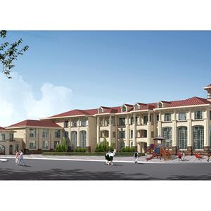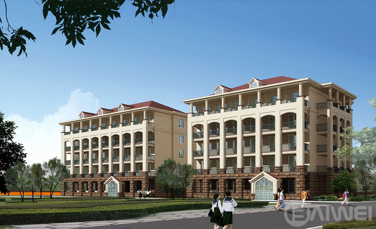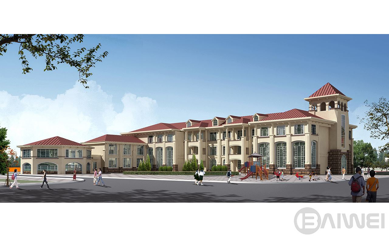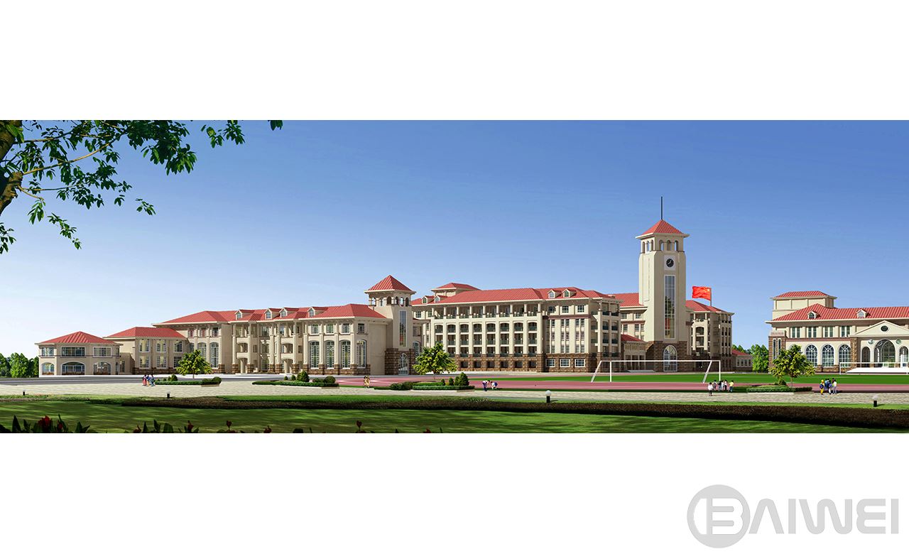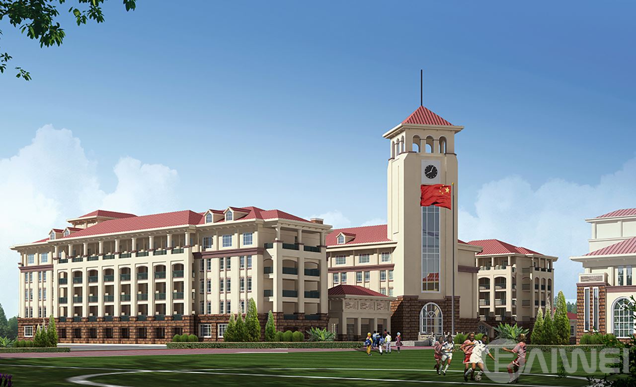 項目位于煙臺市萊山區(qū),共包括中學教學樓,辦公樓,小學教學樓,活動中心,學生宿舍兩棟,餐廳,風雨操場,教室單身宿舍兩棟。學校共42個班,其中小學18個班,中學24個班。建筑整體采用歐式風格,整個建筑群高低錯落,層次分明,以辦公樓鐘樓作為建筑群制高點,統(tǒng)領整個建筑群。建筑以乳白色色調為主,搭配適度褐色。建筑構件、細節(jié)豐富,給在校師生創(chuàng)造一個舒適積極的教學學習環(huán)境。