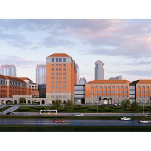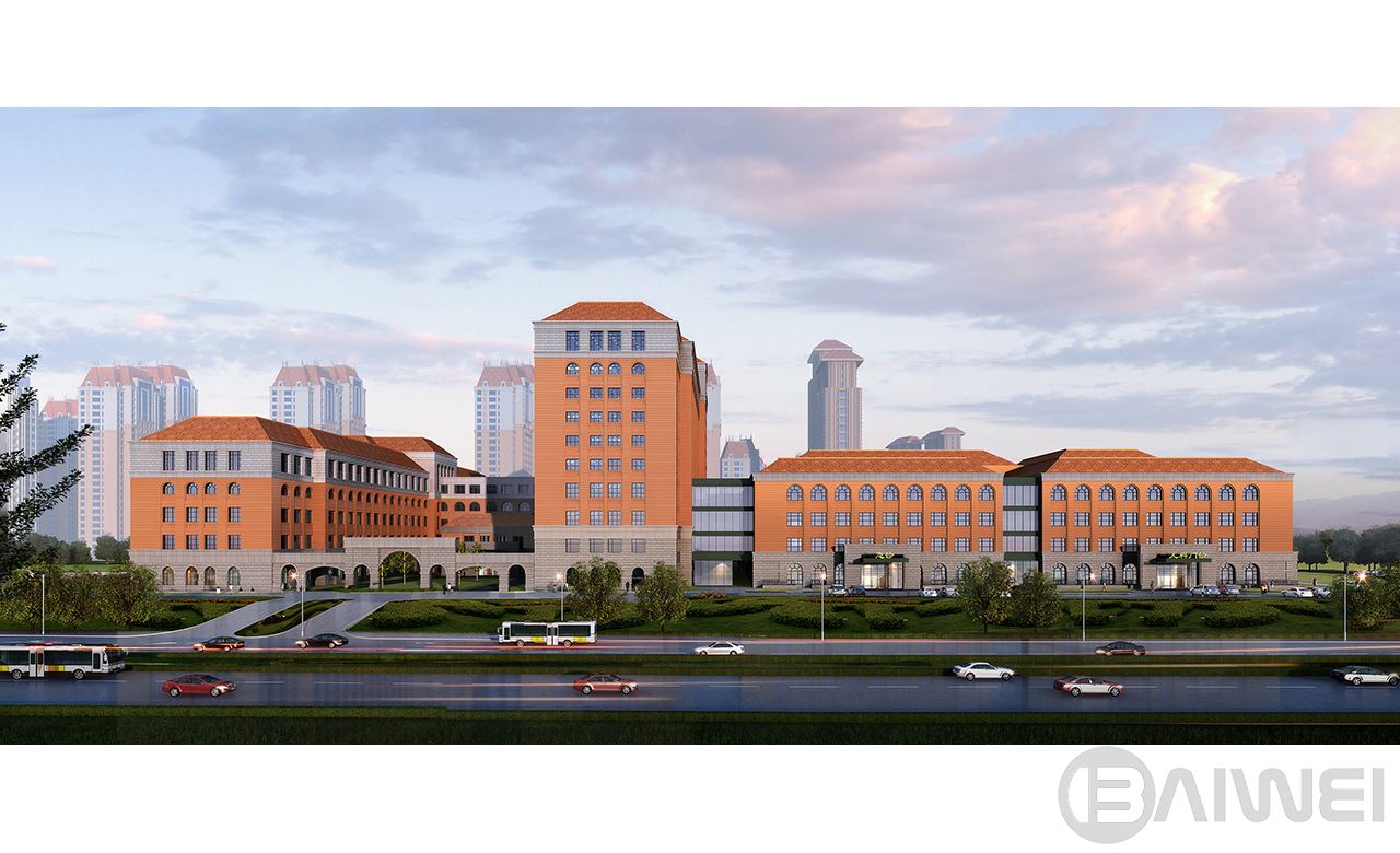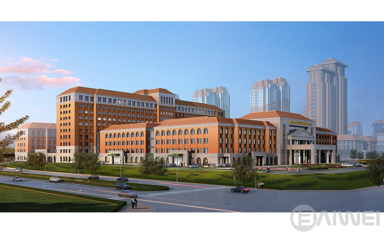 項(xiàng)目基地位于煙臺(tái)市萊山區(qū)西部,按二甲醫(yī)院規(guī)劃設(shè)計(jì),一期設(shè)計(jì)床位550床。包含常用門(mén)急診、兒科、內(nèi)科、外科、婦產(chǎn)科、五官科、中醫(yī)科、皮膚科、變態(tài)反應(yīng)科、放射科、功能檢查科、檢驗(yàn)科、藥房、門(mén)急診輸液、體檢中心、血液透析、產(chǎn)房、NICU、ICU、CCU、手術(shù)部、心導(dǎo)管室、輸血科、病理科、高壓氧艙、放療科、核醫(yī)學(xué)科、中心供應(yīng)室、靜脈配置中心、洗衣房、廚房餐廳、行政辦公等功能科室,并應(yīng)為遠(yuǎn)期發(fā)展做出相應(yīng)的規(guī)劃。設(shè)計(jì)采用對(duì)稱布局,以醫(yī)療區(qū)為主,包含門(mén)急診、醫(yī)技、健康體檢中心和后勤保障用房及住院病房,地下一至二層布置停車(chē)場(chǎng)及其它配套附屬用房等。中部軸線貫通南北兩個(gè)地塊,沿中軸線由南向北呈生長(zhǎng)式發(fā)展。