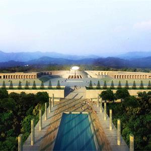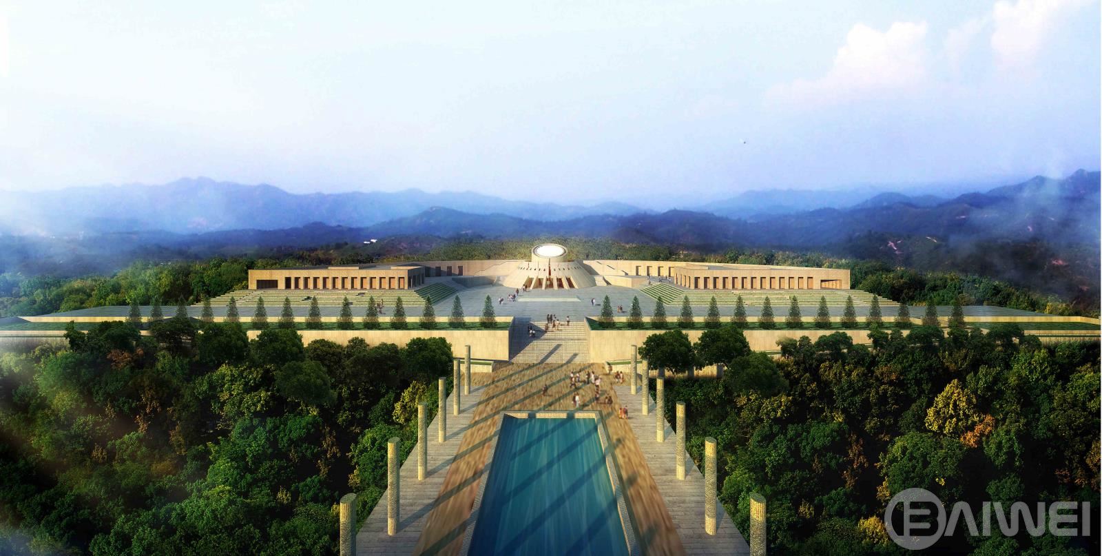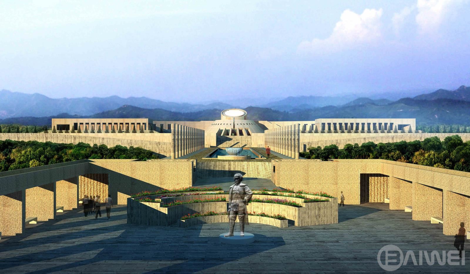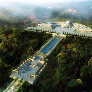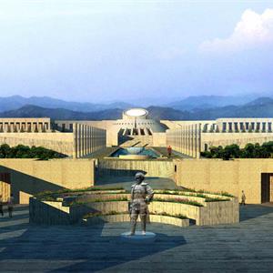 本項目設(shè)計吸收了國內(nèi)外陵園建筑和祭祀建筑的可借鑒的因素,把設(shè)計的重點放在軸線,序列和節(jié)奏的變化上。主要的軸線 安排在現(xiàn)有的通向紀念碑的五百米長的道路的位置上,依次展開入口廣場—追思大道—楊子榮廣場—思源之路—紀念廣場 —紀念館4觀景臺4紀念林4烈士墓等內(nèi)容。