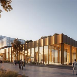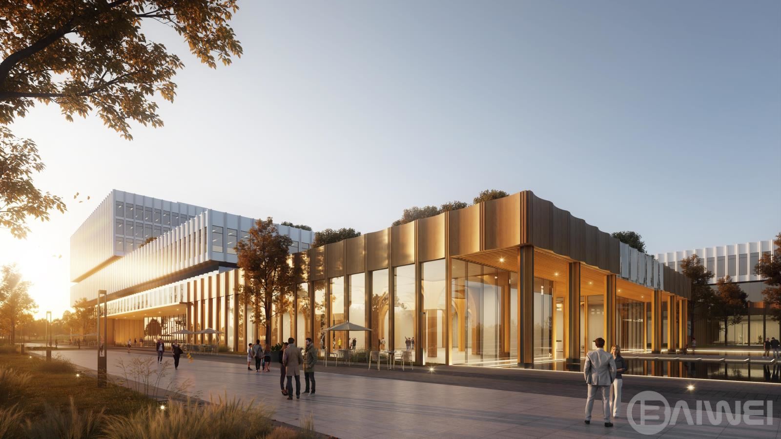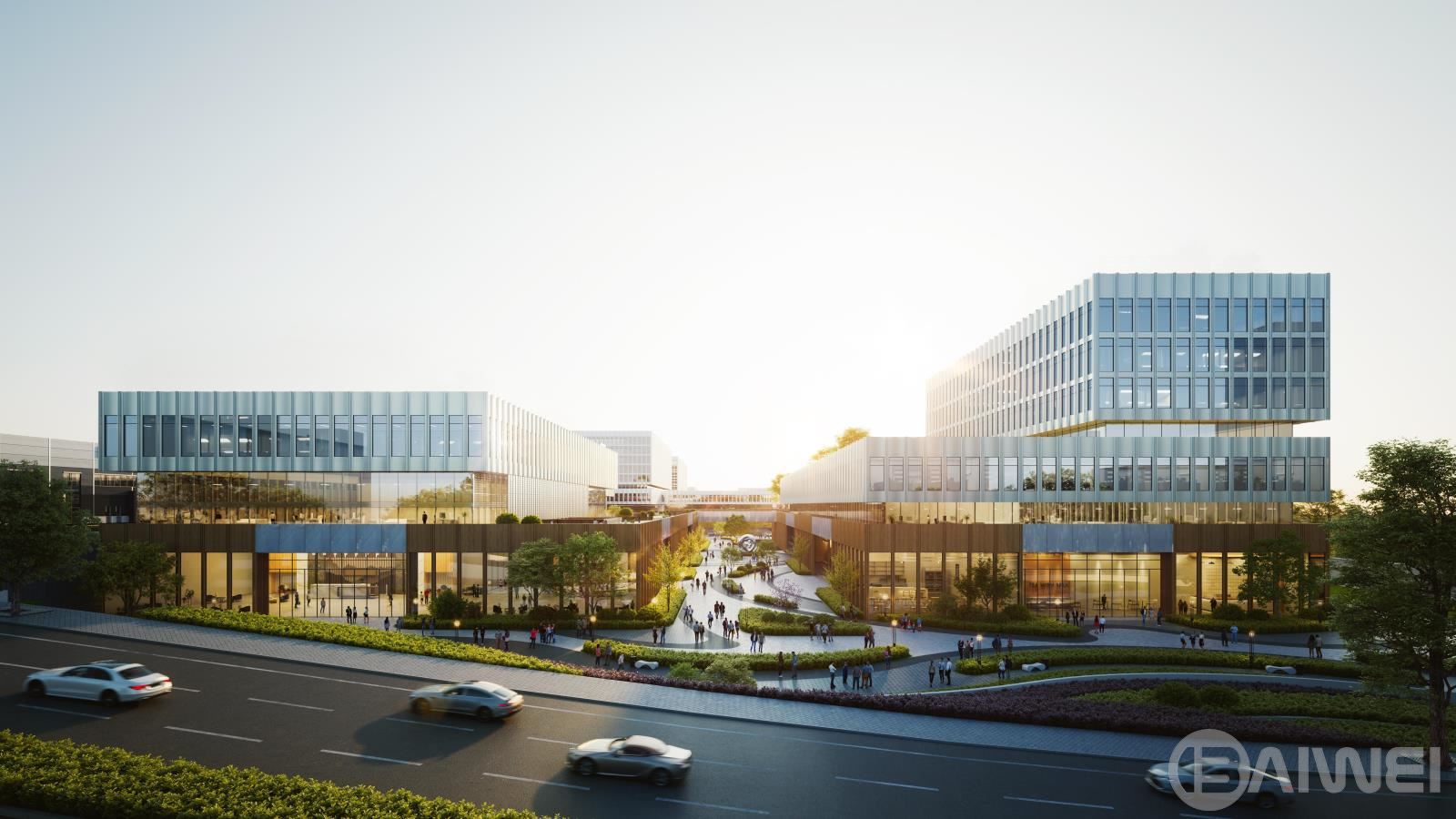 總體造型整體考慮,方案從海上平臺(tái)(藍(lán)鯨壹號(hào))汲取靈感,以模塊化的空間為基準(zhǔn),通過(guò)合理的柱網(wǎng)規(guī)劃,方正靈活配置功能空間,打造高適應(yīng)性產(chǎn)品,實(shí)現(xiàn)多重使用模式的靈活切換。立面設(shè)計(jì)手法簡(jiǎn)潔利落,普通窗墻體系設(shè)計(jì),控制造價(jià),形成簡(jiǎn)潔大氣、體量感明顯的建筑形象,同時(shí)又不失細(xì)節(jié)?!翱萍紕?chuàng)新”與“綠色生態(tài)”相結(jié)合的零碳設(shè)計(jì)是本項(xiàng)目的亮點(diǎn),結(jié)合展廳,跌落的屋頂平臺(tái)成為辦公場(chǎng)所的二次延伸,同時(shí)屋頂亦可有效調(diào)節(jié)微氣候,降低頂層室內(nèi)空間氣溫調(diào)節(jié)的能耗,為園區(qū)提供生態(tài)和諧的辦公研發(fā)環(huán)境。廠房亦延續(xù)海工平臺(tái)理念,廠區(qū)立面采用從深至淺,從海洋到天空。結(jié)合不同金屬板顏色,做出細(xì)節(jié)變化,控制造價(jià)的同時(shí),又形成簡(jiǎn)潔現(xiàn)代的廠房形象。